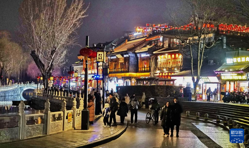 游人在燈光璀璨的北京后海景區(qū)休閑(2月2日攝)。