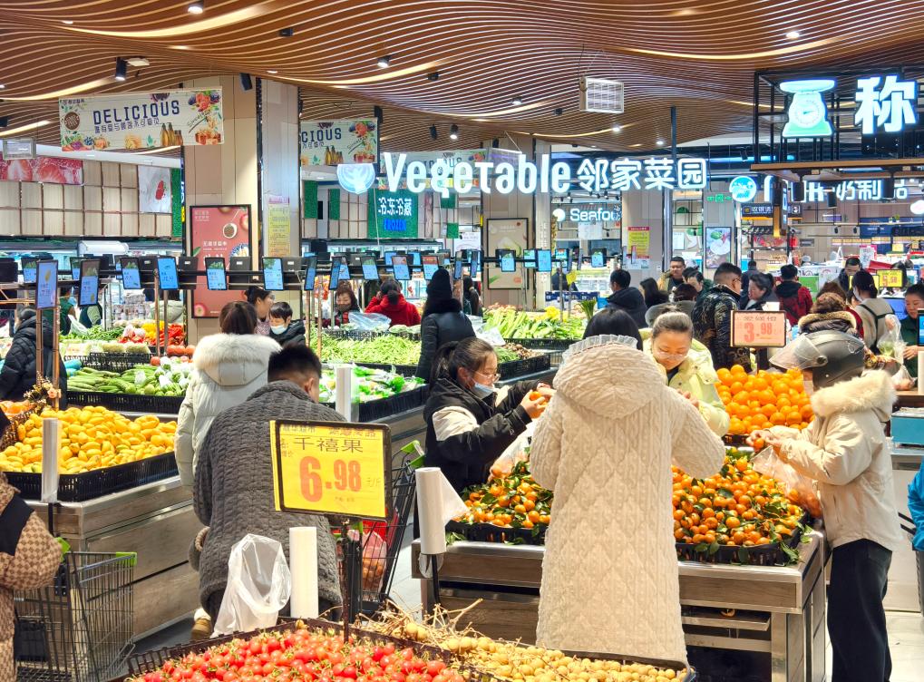 2月2日傍晚,安徽省滁州市鳳陽(yáng)縣的一家大型商超內(nèi),人們正在生鮮食品區(qū)選購(gòu)。新華社記者郭晨 攝