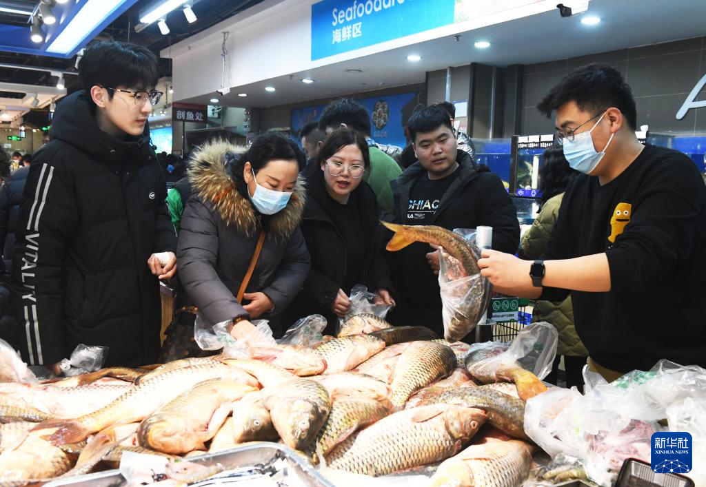 2月7日,顧客在河北石家莊新樂(lè)市一家超市選購(gòu)海鮮產(chǎn)品。