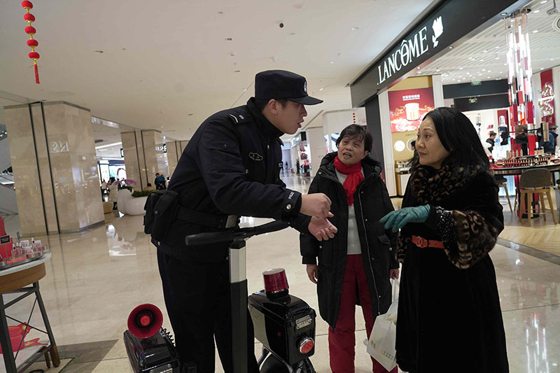 春節(jié)期間,湖北省武漢市公安局武昌區(qū)分局梅苑派出所民警肖楠和同事用心守護(hù)武商夢時(shí)代廣場的平安。