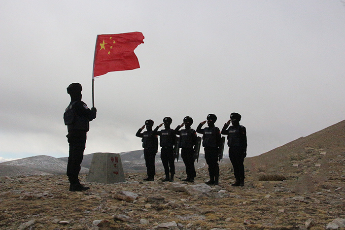 圖為民警在界樁前面向國旗莊嚴(yán)敬禮