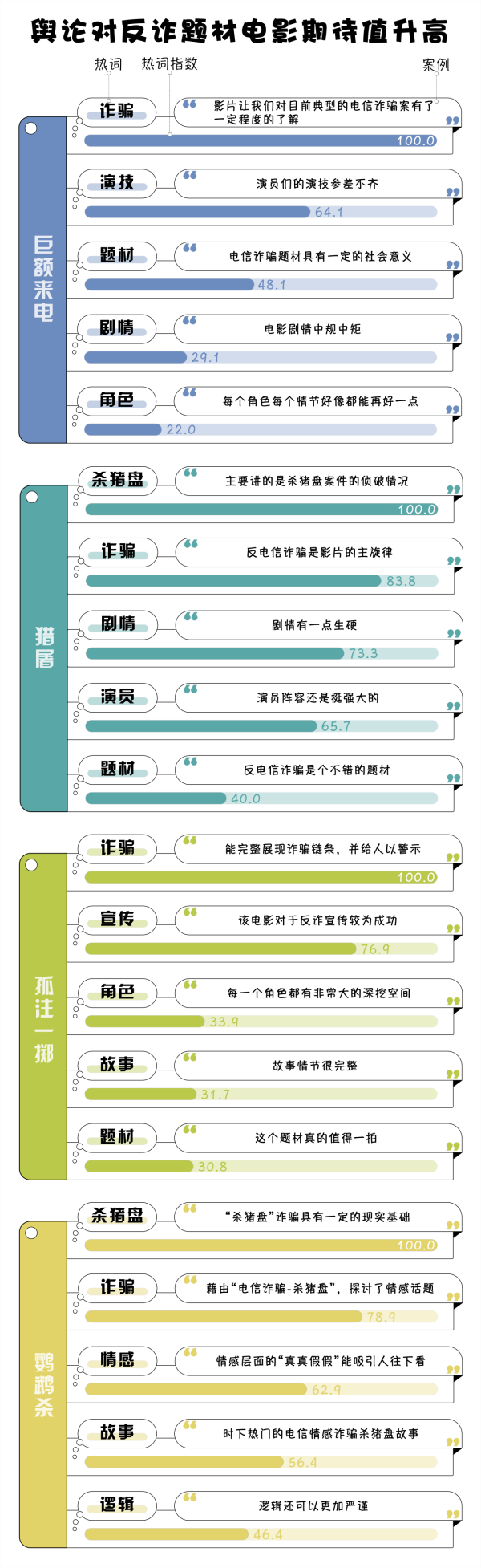 綜合輿論來看,反電詐電影作為橋梁,“拉近”了電信網(wǎng)絡詐騙與觀眾的距離,助推“全民反電詐”情緒日漸高漲。反電詐電影除本身的電影屬性外,在一定程度上起到了宣傳教育的作用,肩負著喚醒公眾反電詐意識的社會責任,“題材高于電影本身”的聲音時常出現(xiàn)在輿論場中。在全民反電詐的時代潮流之中,優(yōu)秀的電影能推動反電詐事業(yè)的進步,相信在如此高漲的反電詐氛圍之中,也將催生出一批質(zhì)量上乘、口碑良好的反電詐電影,讓我們一起期待!