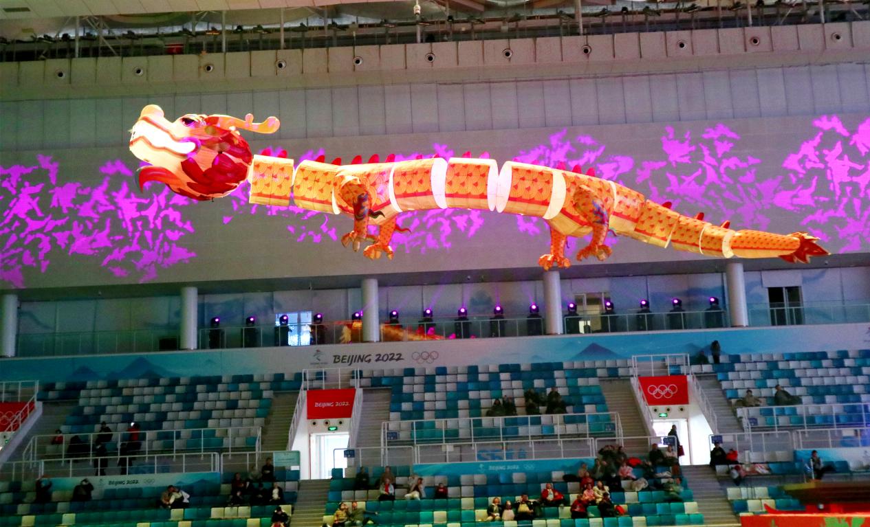 在水立方奧林匹克比賽大廳上空,30米長(zhǎng)的巨龍配合現(xiàn)場(chǎng)聲光電效果,從場(chǎng)館水面騰升而起,“若空游無所依”的巨龍景觀與奧林匹克中心區(qū)龍形水系遙相呼應(yīng),吉祥寓意氛圍感瞬間拉滿。