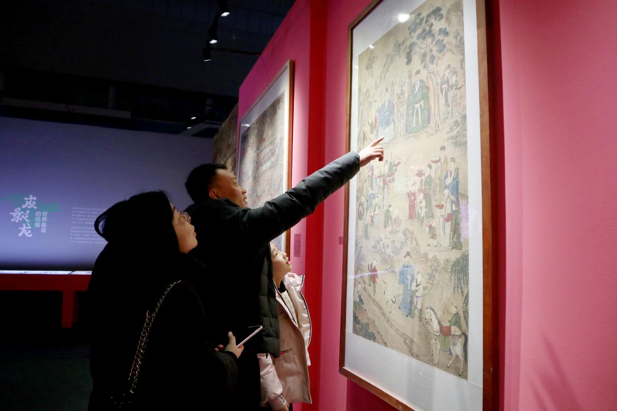 圖為游客在“喜樂過龍年”展覽中觀賞《祝壽圖》。