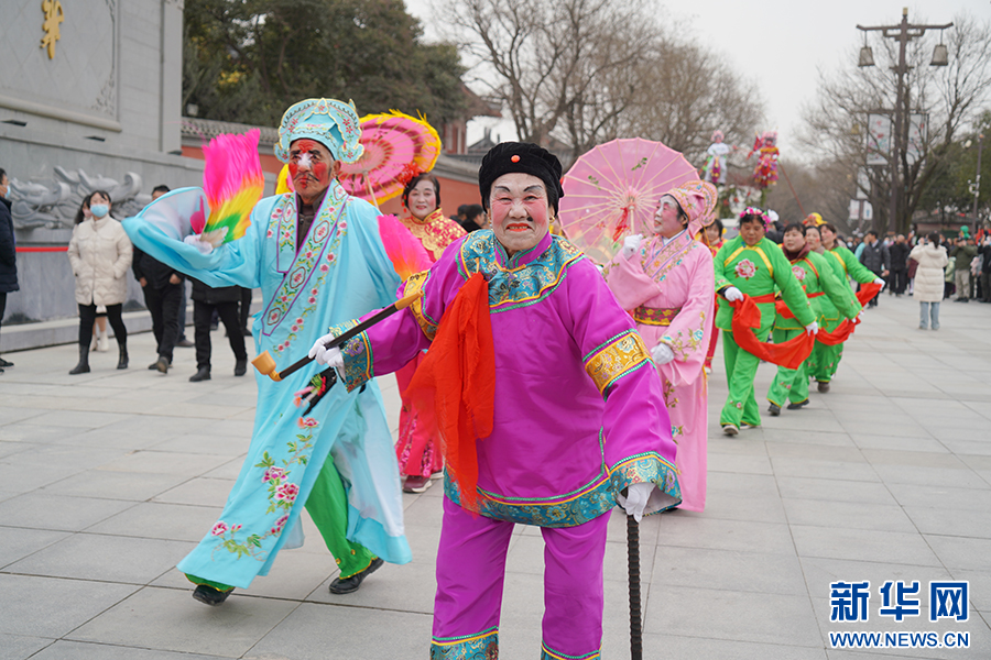 2月19日,在西安市臨潼區(qū)大唐華清城廣場(chǎng),西安市非物質(zhì)文化遺產(chǎn)項(xiàng)目“背芯子”表演。王三合攝