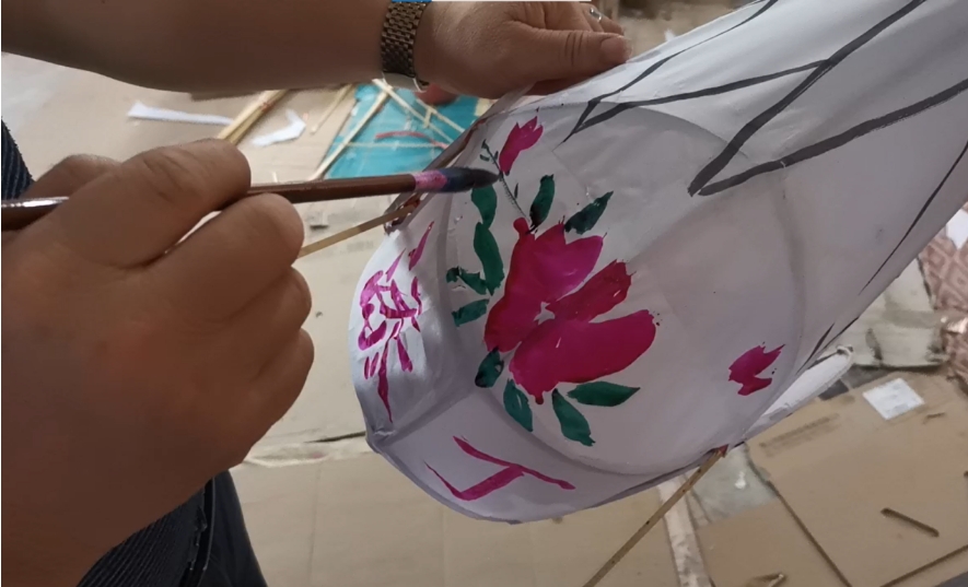 周芙明常用紅、綠、藍(lán)、黃幾種顏色。這樣畫出來(lái)的燈籠五彩斑斕,很是醒目。上好色、晾曬好的燈籠仍然少頭缺尾,此時(shí)再用彩帶纏至“雞尾”,糊上用紙做成的“雞冠”,這才算是大功告成。
