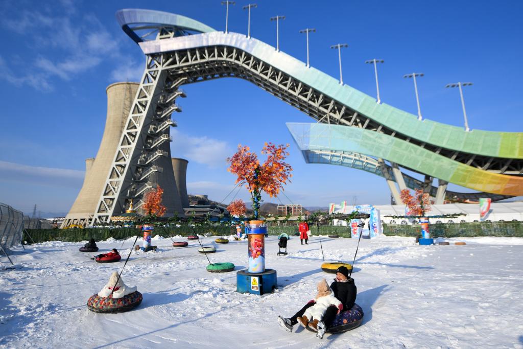 2023年12月24日,游客在首鋼滑雪大跳臺下的“首鋼園冰雪匯”體驗(yàn)雪上游樂項(xiàng)目。新華社記者 鞠煥宗 攝