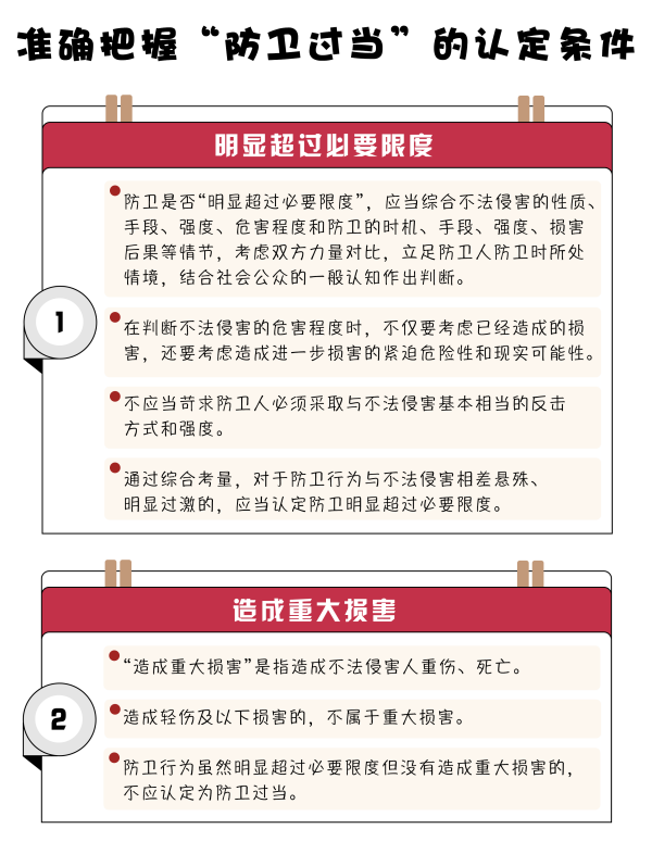 根據(jù)刑法第二十條第二款的規(guī)定,認(rèn)定防衛(wèi)過(guò)當(dāng)應(yīng)當(dāng)同時(shí)具備“明顯超過(guò)必要限度”和“造成重大損害”兩個(gè)條件,缺一不可。