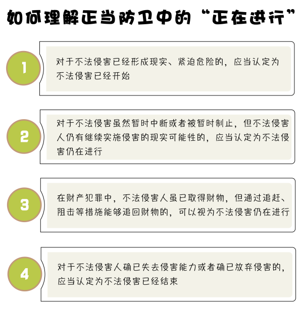 《關(guān)于依法適用正當(dāng)防衛(wèi)制度的指導(dǎo)意見(jiàn)》明確規(guī)定,正當(dāng)防衛(wèi)必須是針對(duì)“正在進(jìn)行”的不法侵害。