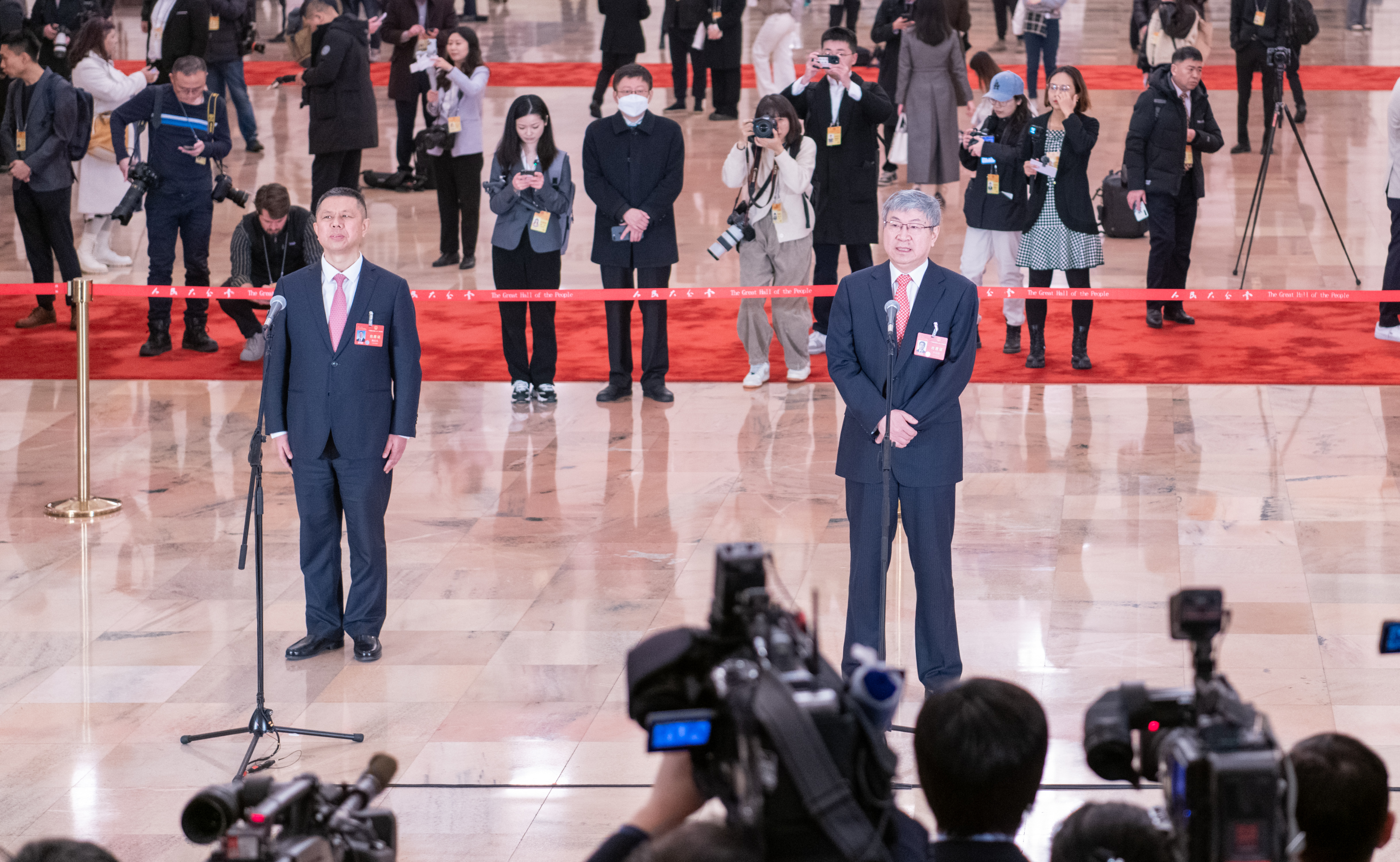 3月5日,十四屆全國人大二次會(huì)議首場“代表通道”采訪活動(dòng)在北京人民大會(huì)堂舉行。圖為奇瑞控股集團(tuán)董事長尹同躍代表(右)、天合光能股份有限公司董事長高紀(jì)凡代表接受記者采訪。 本報(bào)記者 王建軍 攝