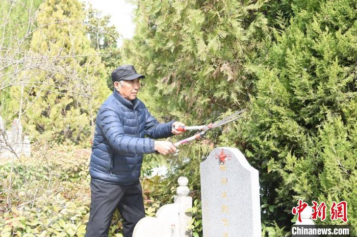 中新網(wǎng)徐州3月16日電 (朱志庚 譚曉立)“既然找不到烈士的家屬,那么我就是他們的親人,39年來逢年過節(jié)我都會(huì)代替他們家屬過來祭掃?!?月15日,江蘇省睢寧縣雙溝鎮(zhèn)紀(jì)灣村村民紀(jì)厚軍來到紀(jì)灣烈士陵園修剪松樹、綠植,為烈士墓碑描紅、擦拭。