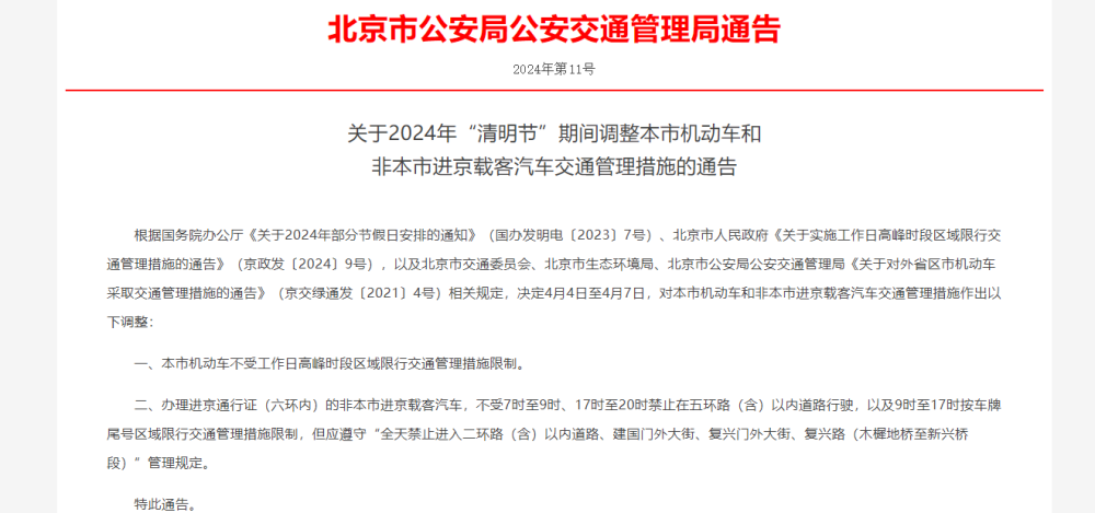 關于2024年“清明節(jié)”期間調整本市機動車和非本市進京載客汽車交通管理措施的通告