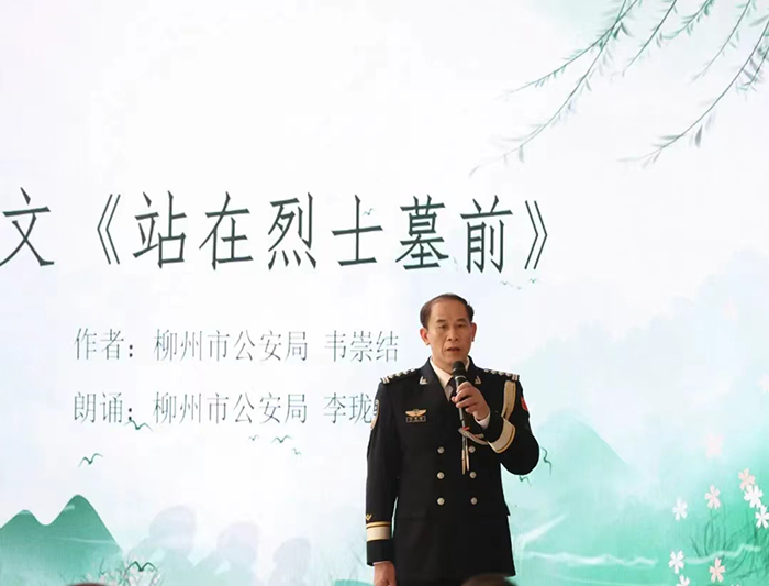 “群山肅穆,蒼松挺立,那一排排青灰的墓碑,在清明期間難得一見(jiàn)的陽(yáng)光中閃著金色的光,數(shù)千名烈士安靜地長(zhǎng)眠在這里……”清明至,柳州市公安局民警韋崇結(jié)創(chuàng)作的散文《站在烈士墓前》,深切懷念昔日英勇?tīng)奚膽?zhàn)友。韋崇結(jié)上臺(tái)分享創(chuàng)作感想時(shí)說(shuō),我們緬懷英烈,就是要繼承他們的遺志,從中汲取力量,繼續(xù)前行。