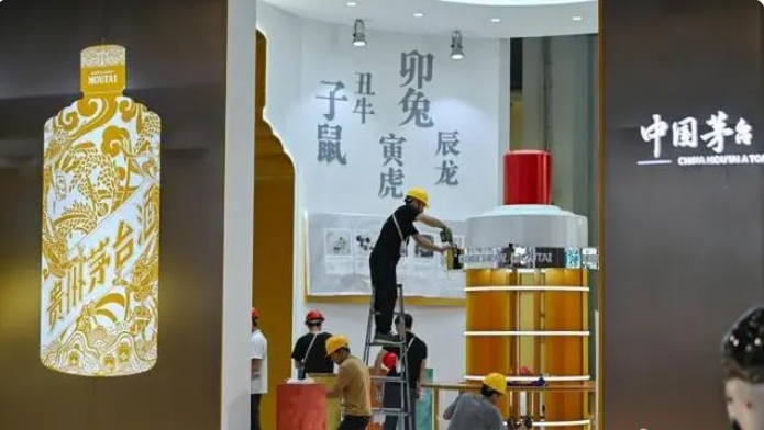 4月10日,第四屆中國(guó)國(guó)際消費(fèi)品博覽會(huì)參展物品陸續(xù)上架。圖為茅臺(tái)展位的工作人員進(jìn)行收尾施工。中新社記者 駱云飛 攝