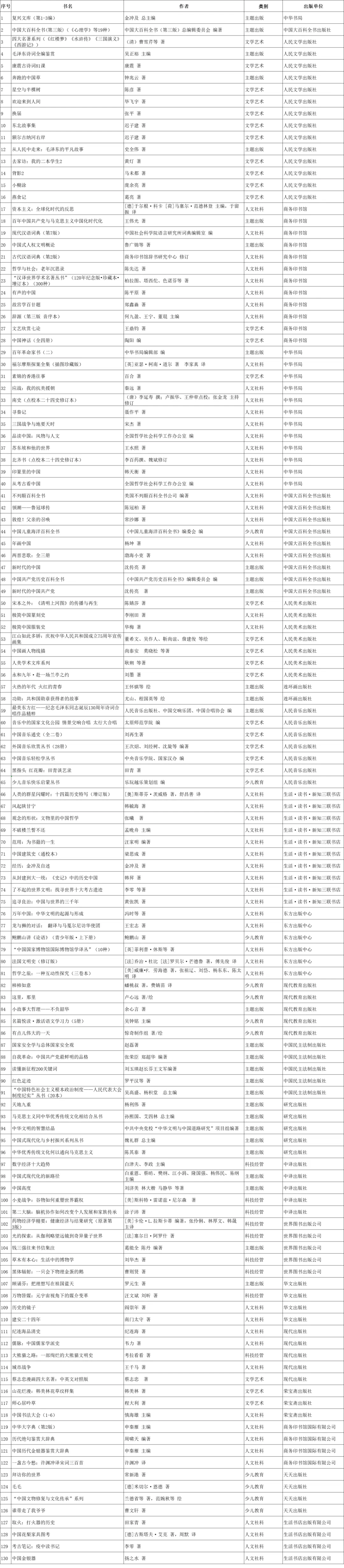 “中國出版集團(tuán)2024年全民閱讀書單”,共130種精品。其中,主題出版類29種,人文社科類54種,文學(xué)藝術(shù)類27種,科技經(jīng)管類9種,少兒教育類11種。既有《復(fù)興文庫》《中國大百科全書(第三版)》等重磅產(chǎn)品,也有“漢譯世界學(xué)術(shù)名著叢書”等暢銷精品;既有《星空與半棵樹》等獲獎(jiǎng)作品,也有《誰帶走了我爺爺》等少兒新作。
