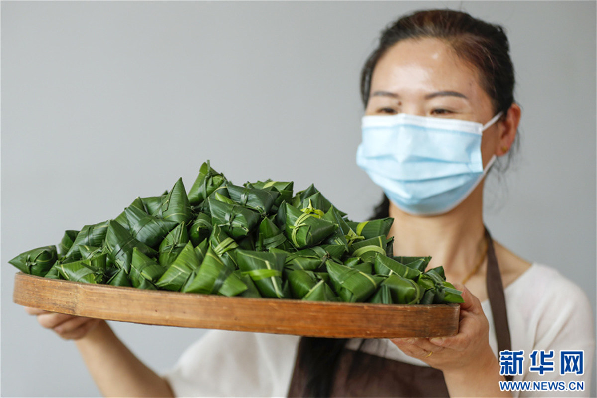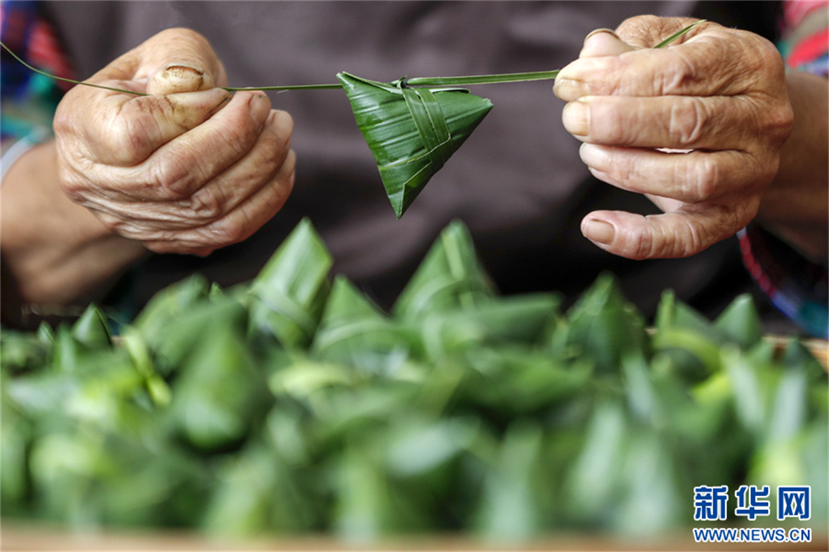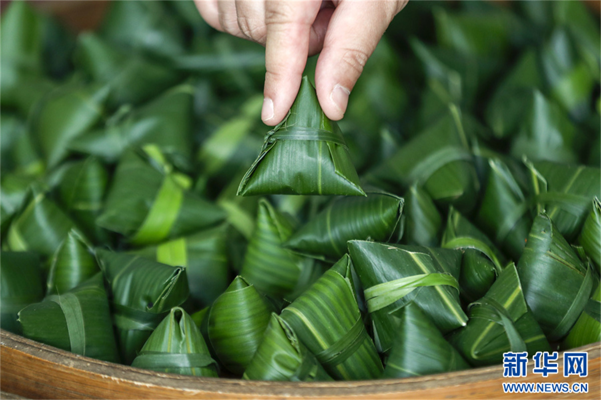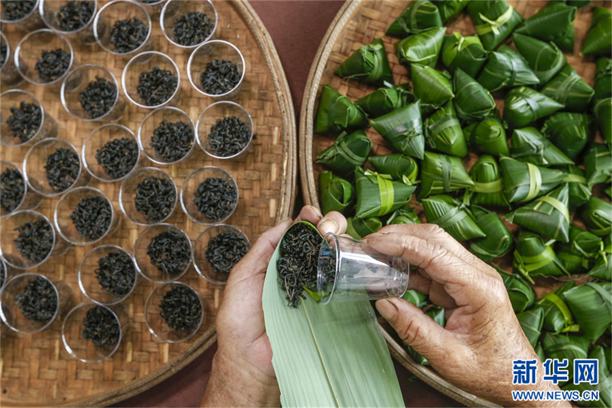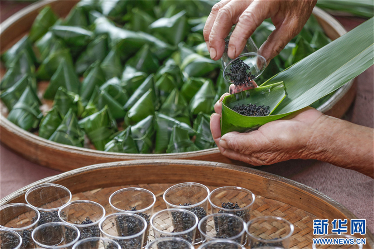 端午臨近,在安徽省黃山市祁門(mén)縣古溪鄉(xiāng)際源村,茶工以祁門(mén)紅茶為“餡料”,用傳統(tǒng)包粽子的方法,純手工制作“粽茶”?!棒詹琛毙∏闪岘?,浸泡出來(lái)的茶湯,既有箬葉香,又有紅茶香,好看又好喝的“粽茶”,深受消費(fèi)者的喜愛(ài)。新華網(wǎng)發(fā)(施亞磊 攝)