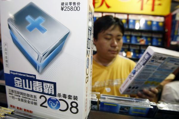 圖為2008年8月16日,某正版軟件商店內(nèi),顧客在選購國產(chǎn)正版殺毒軟件。 (視覺中國)
