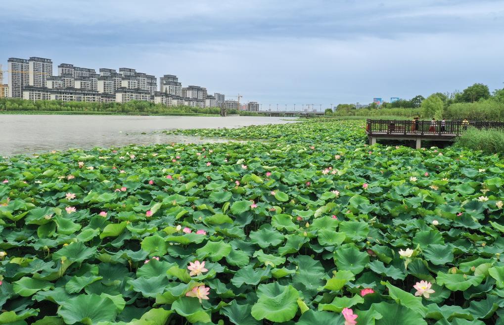 6月21日,陜西省富平縣石川河國(guó)家濕地公園內(nèi)荷花盛開(kāi)。新華社記者 李賀 攝