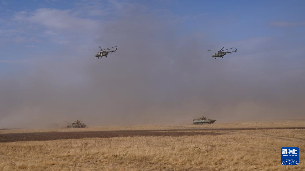 2021年9月23日,在俄羅斯奧倫堡州東古茲靶場舉行的“和平使命-2021”上海合作組織聯(lián)合反恐軍事演習(xí)實(shí)兵實(shí)彈演習(xí)中,多國聯(lián)合部隊(duì)進(jìn)行陸空協(xié)同作戰(zhàn)。新華社記者 梅世雄 攝