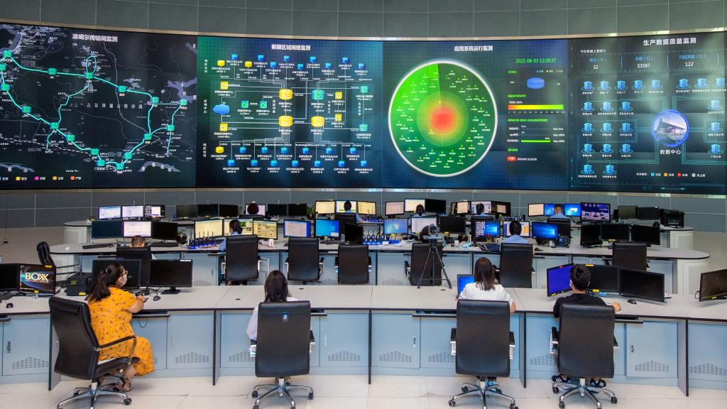 2023年12月6日,中國石油新疆油田公司生產(chǎn)指揮中心的監(jiān)控大屏實(shí)時(shí)顯示油田生產(chǎn)動態(tài)數(shù)據(jù)。新華社發(fā)(閔勇 攝)