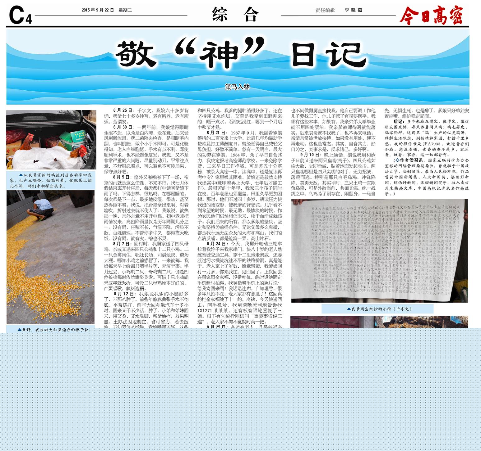 2015年9月22日,《今日高密》刊發(fā)《敬“神”日記》。