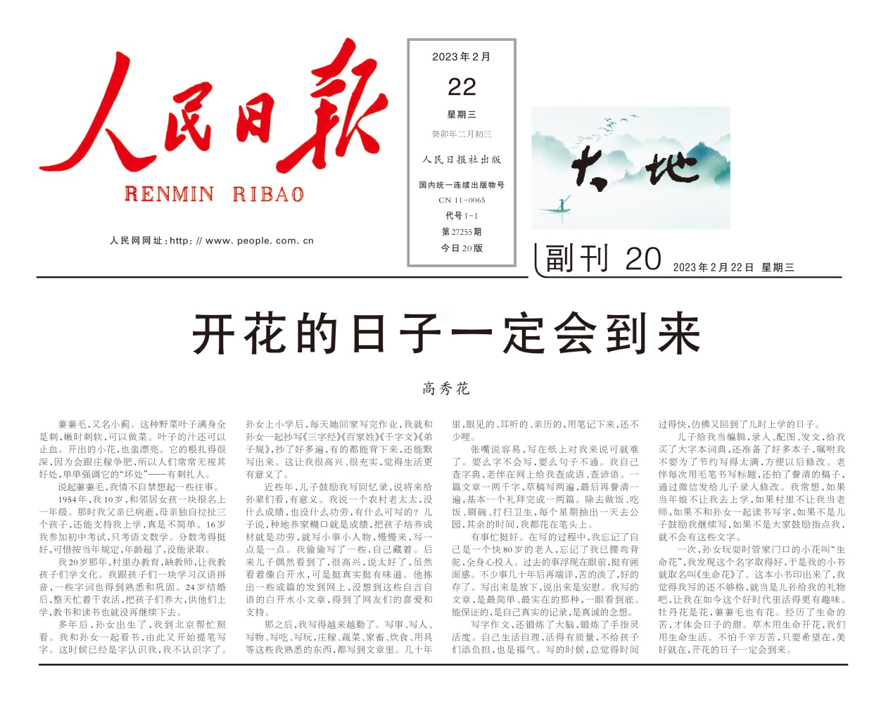 2023年2月22日,《人民日報》刊發(fā)我母親的文章《開花的日子一定會到來》。