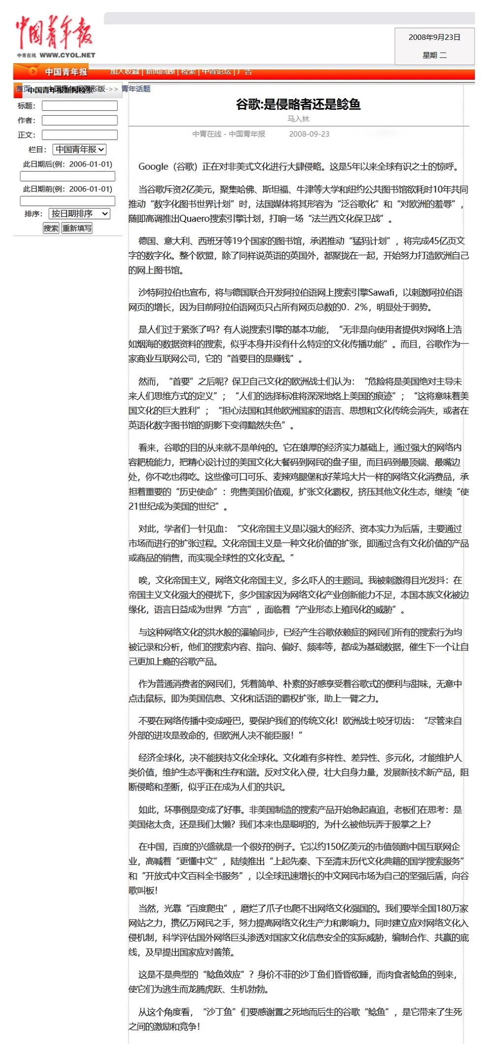2008年9月23日,《中國青年報》“青年話題”專欄刊發(fā)《谷歌:是侵略者還是鯰魚》。