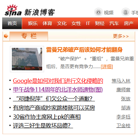 2008年9月18日,新浪博客首頁推薦《Google是如何對我們進行文化侵略的》,標題為編輯所改。
