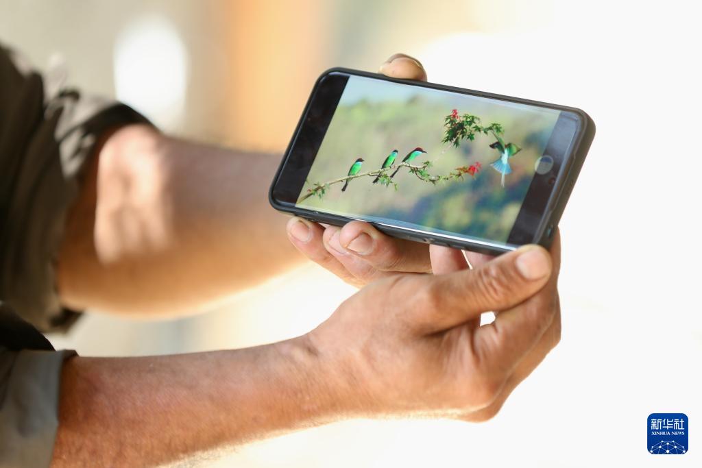 8月12日,福建南平市延平區(qū)爐下鎮(zhèn)斜溪村村民王崇年展示手機里攝影愛好者發(fā)來的藍喉蜂虎照片?!⌒氯A社記者 姜克紅 攝