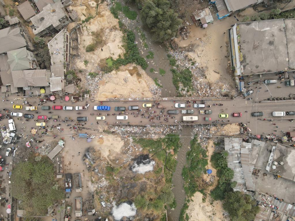 8月17日,在剛果(金)首都金沙薩郊區(qū)的金蘇卡大橋上,通行車輛在橋上駛過。(無人機(jī)照片)