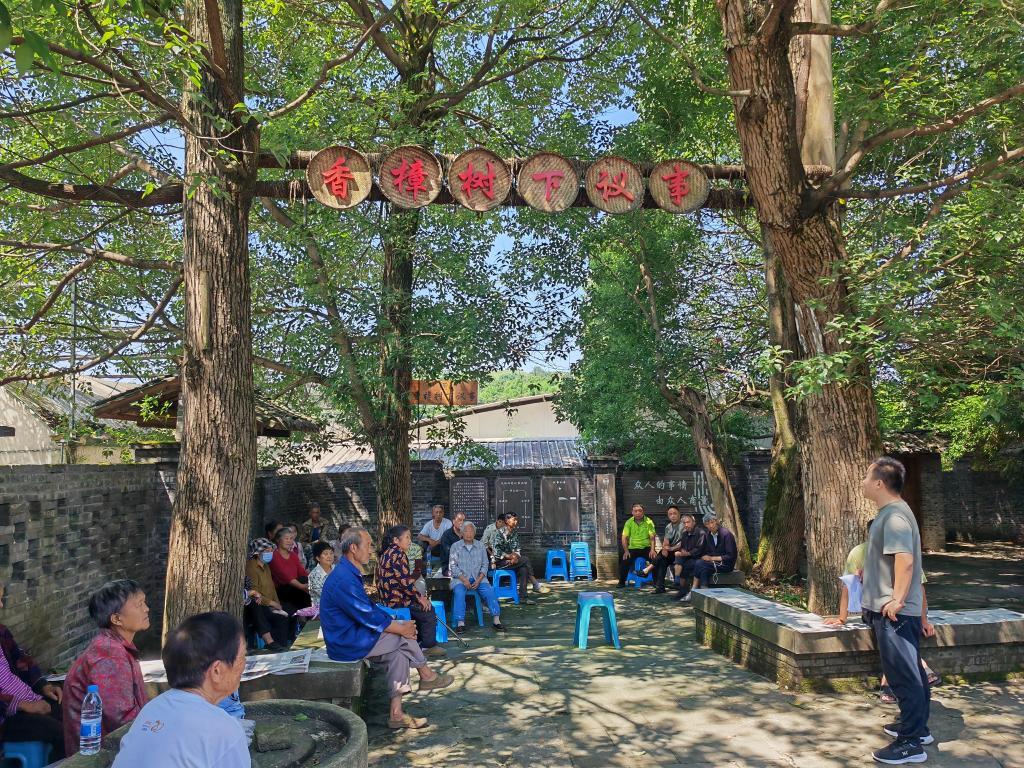 重慶市南川區(qū)木涼鎮(zhèn)漢場(chǎng)壩村的村民們?cè)谙阏翗?shù)下聆聽(tīng)普法故事。新華社記者周思宇 攝