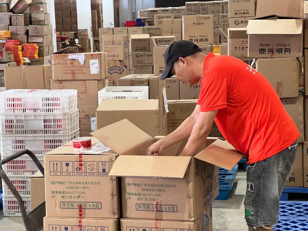9月12日,在廣西北海市合浦縣的月餅小鎮(zhèn)一處庫房內(nèi),工人正將月餅打包裝箱。新華社記者張卓文 攝