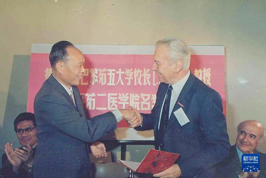 上海第二醫(yī)學(xué)院(現(xiàn)上海交通大學(xué)醫(yī)學(xué)院)校長王振義(前左)授予法國巴黎第五大學(xué)校長歐基埃名譽教授稱號(攝于1985年)。新華社發(fā)(上海交通大學(xué)醫(yī)學(xué)院供圖)