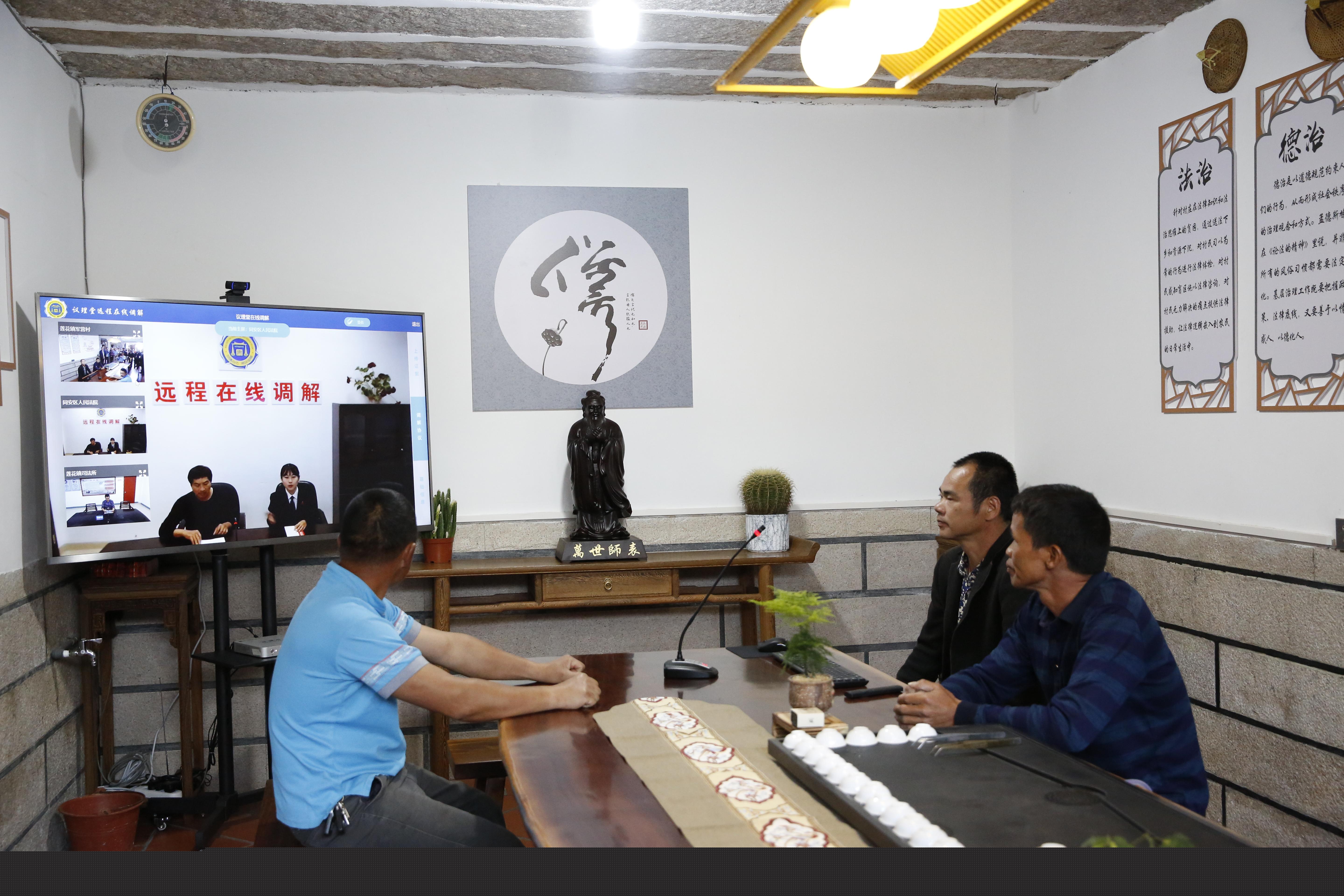 軍營村“高山議理堂”中,同安區(qū)人民法院、蓮花鎮(zhèn)司法所的工作人員正在為村民遠程調(diào)解矛盾解紛、普法。受訪者供圖