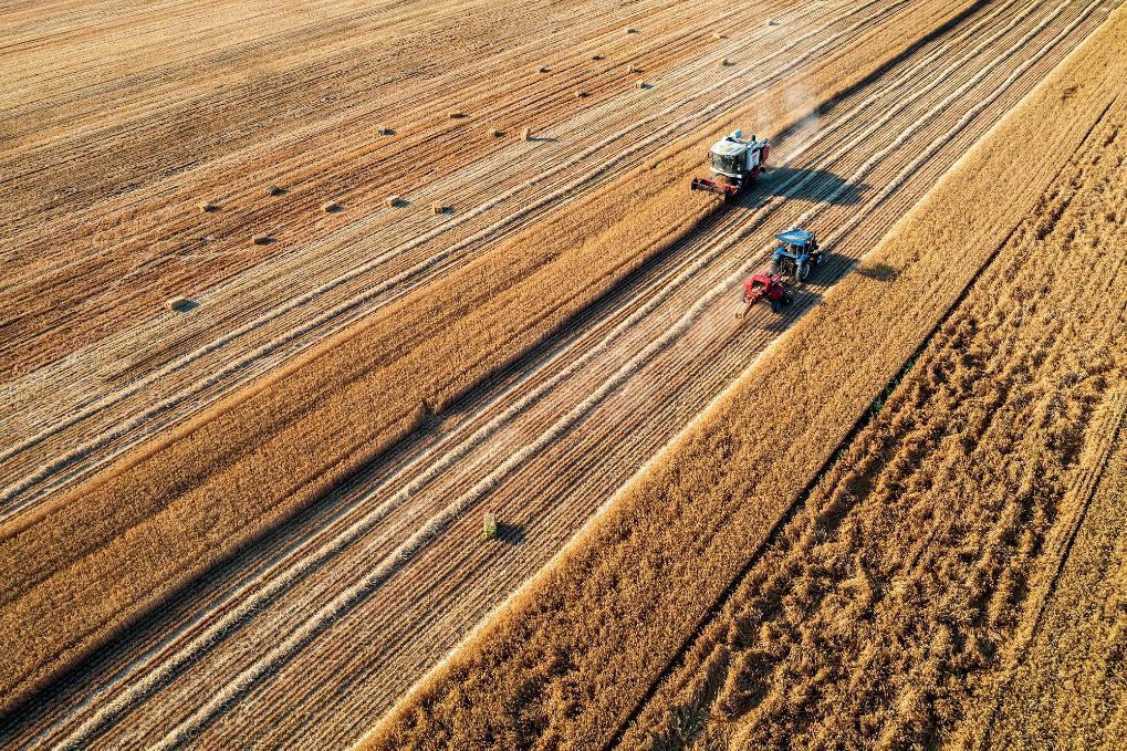 2024年5月27日,農(nóng)機手駕駛農(nóng)機在河南省商丘市梁園區(qū)孫福集鄉(xiāng)崔樓村收獲小麥(無人機照片)。新華社發(fā)(李恒 攝)