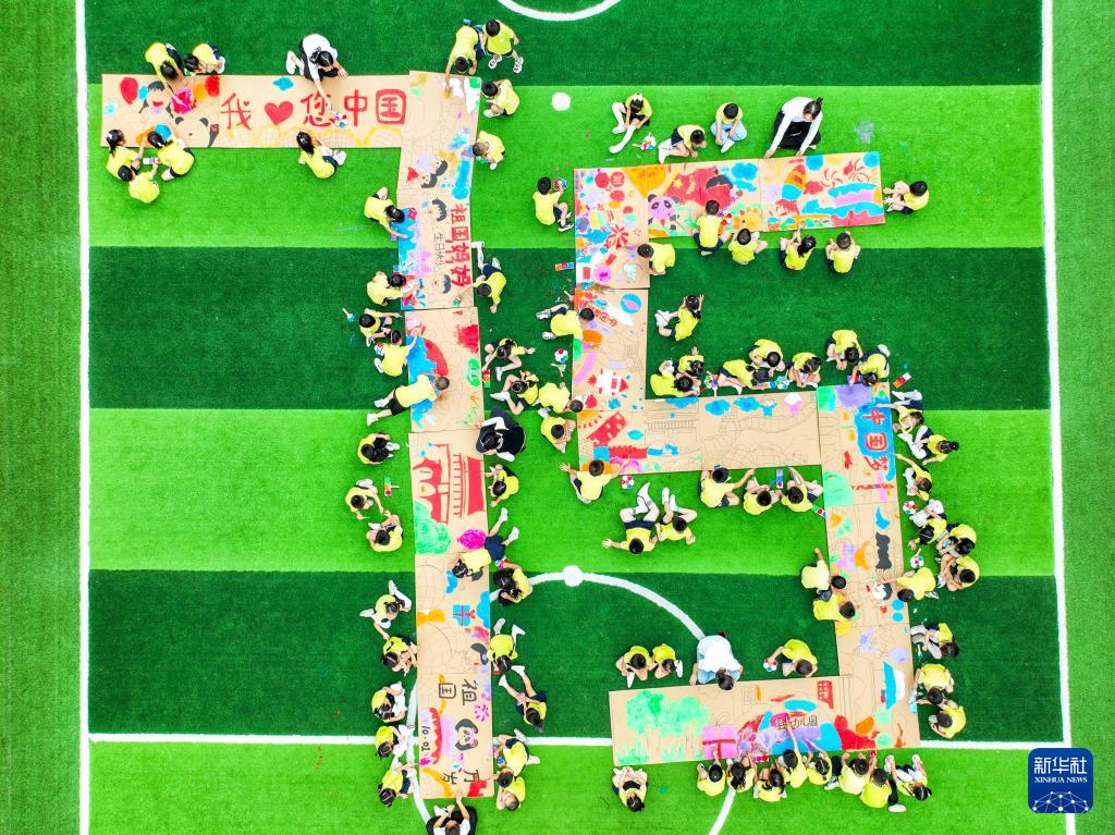 9月26日,江西省宜春市銅鼓縣幼兒園的孩子們在操場上創(chuàng)作國慶主題繪畫作品(無人機照片)。
