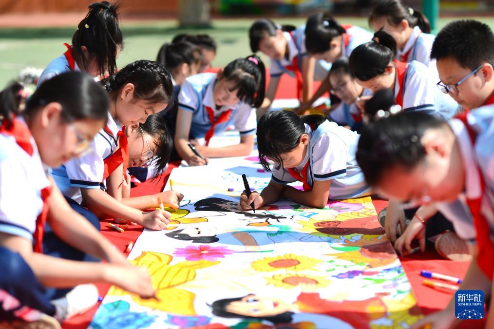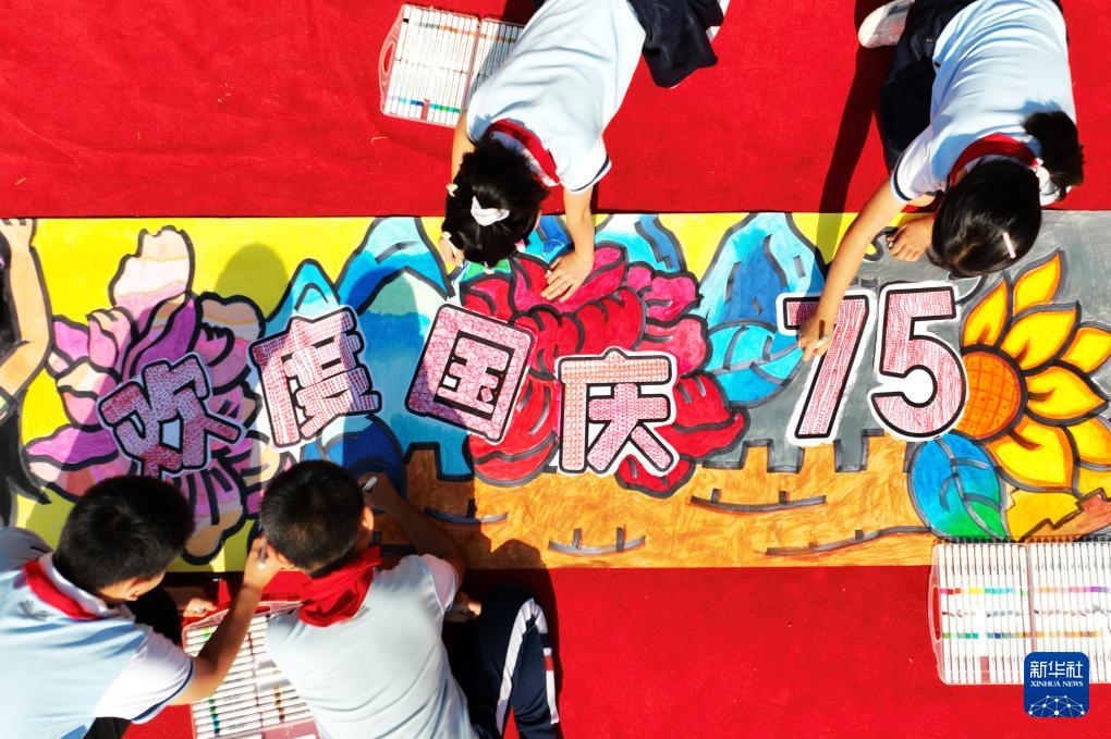 9月28日,在山東青島重慶路第三小學(xué),孩子們共繪迎佳節(jié)彩色畫卷(無人機(jī)照片)。