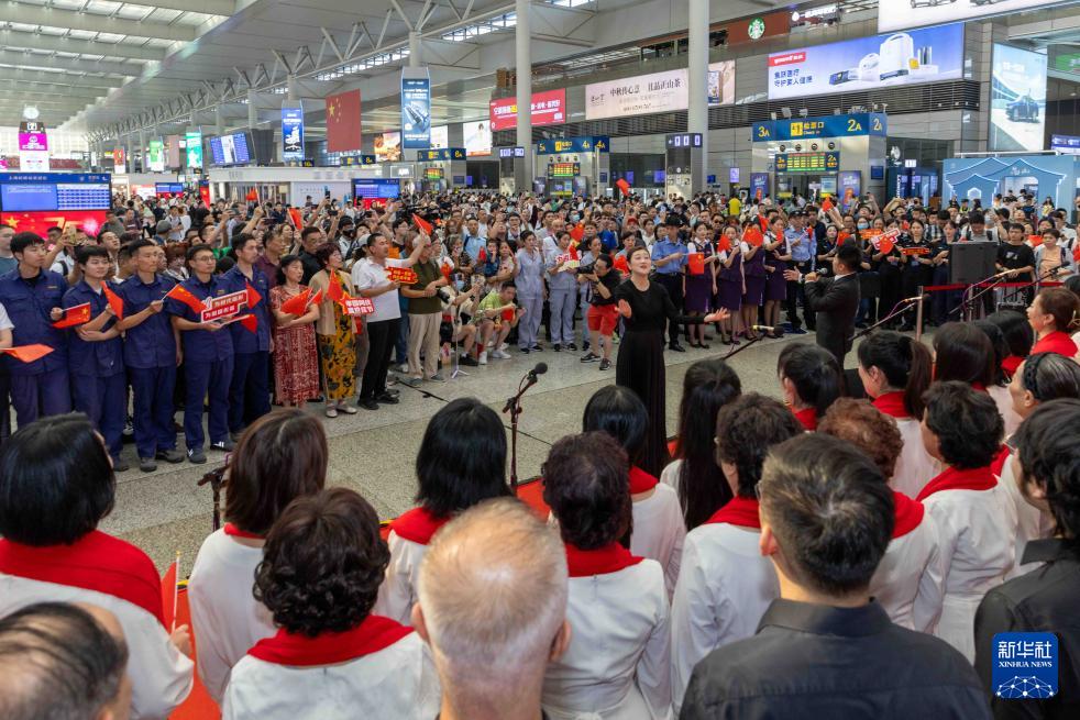 9月28日,鐵路上海站聯(lián)合中國上海國際藝術節(jié)中心在上海虹橋站候車室開展迎國慶快閃活動,演員在活動中演唱歌曲。