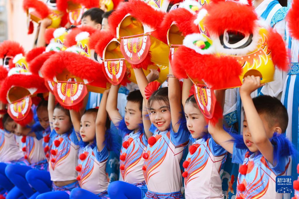9月27日,在山東青島北仲路第一小學(xué)開(kāi)展的國(guó)慶主題系列活動(dòng)上,小學(xué)生在表演獅子舞。