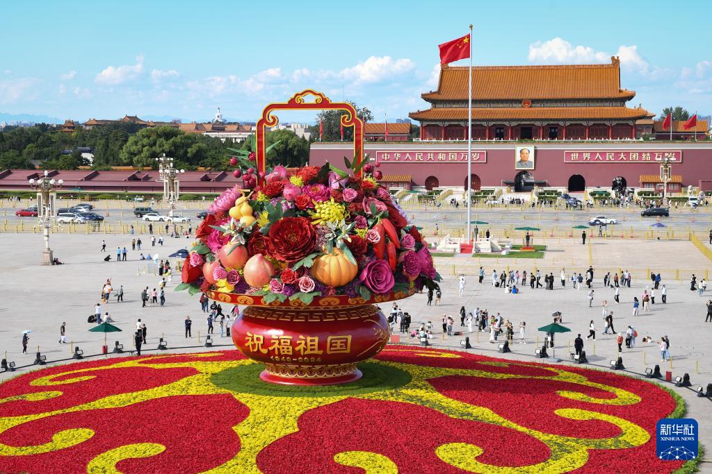 9月25日拍攝的天安門廣場(chǎng)“祝福祖國(guó)”巨型花籃。
