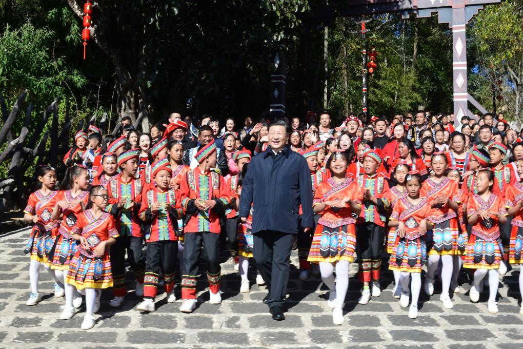2020年1月19日至21日,習(xí)近平總書記來到云南,看望慰問各族干部群眾,向全國(guó)人民致以新春祝福。這是19日下午,騰沖市清水鄉(xiāng)三家村中寨司莫拉佤族村的鄉(xiāng)親們唱著《阿佤人民唱新歌》,簇?fù)碇?xí)近平總書記走出村口。新華社記者 謝環(huán)馳 攝