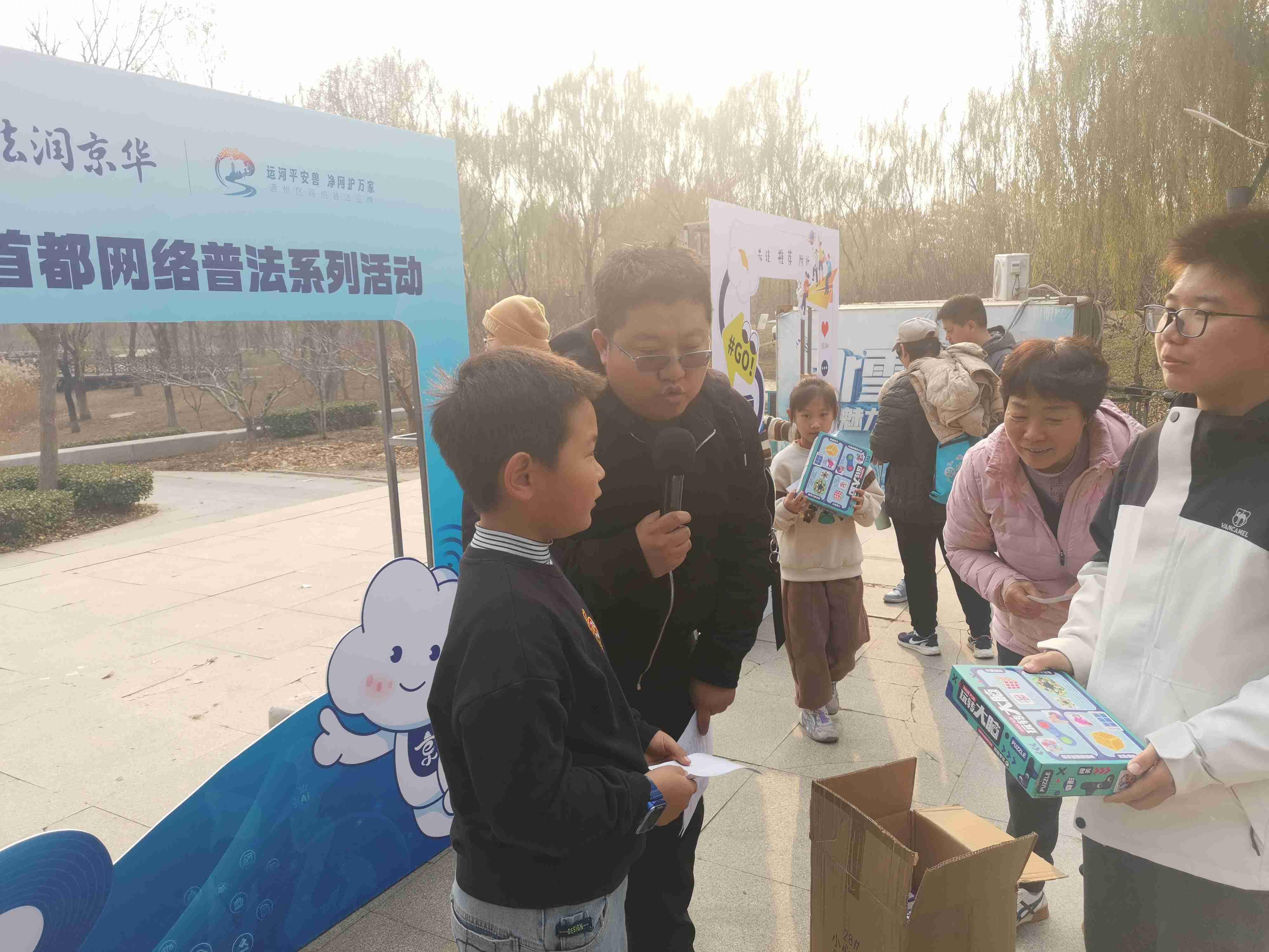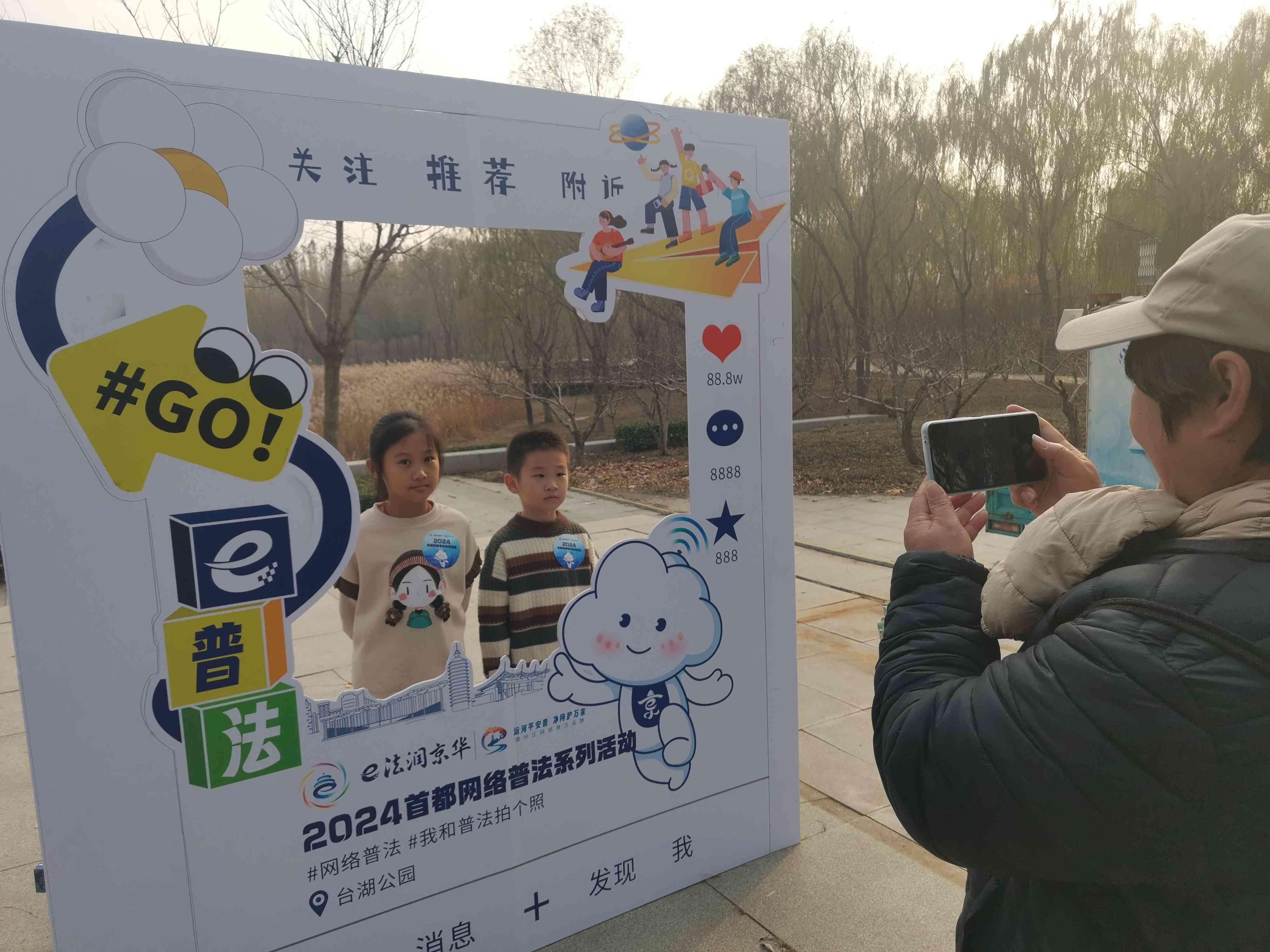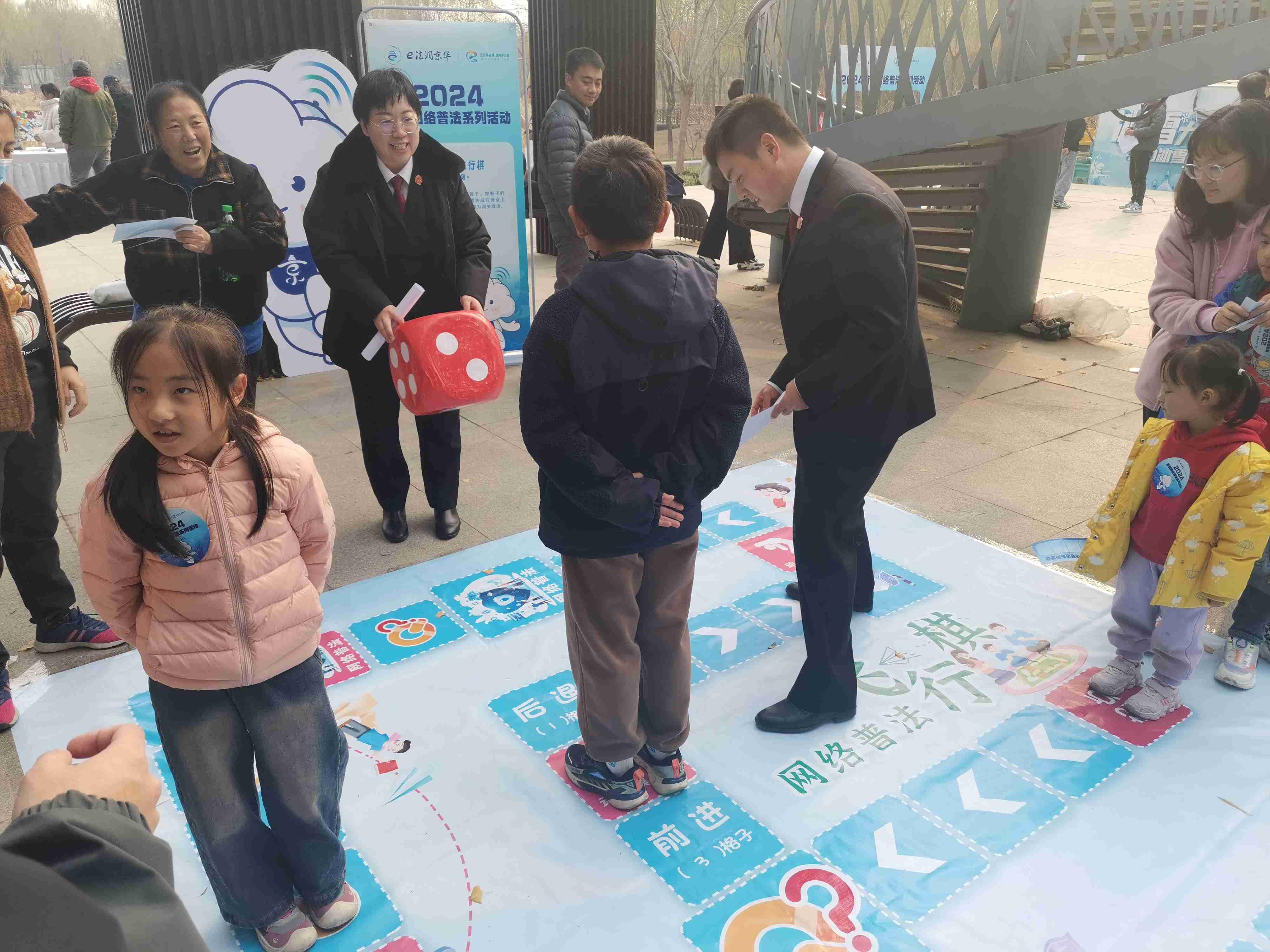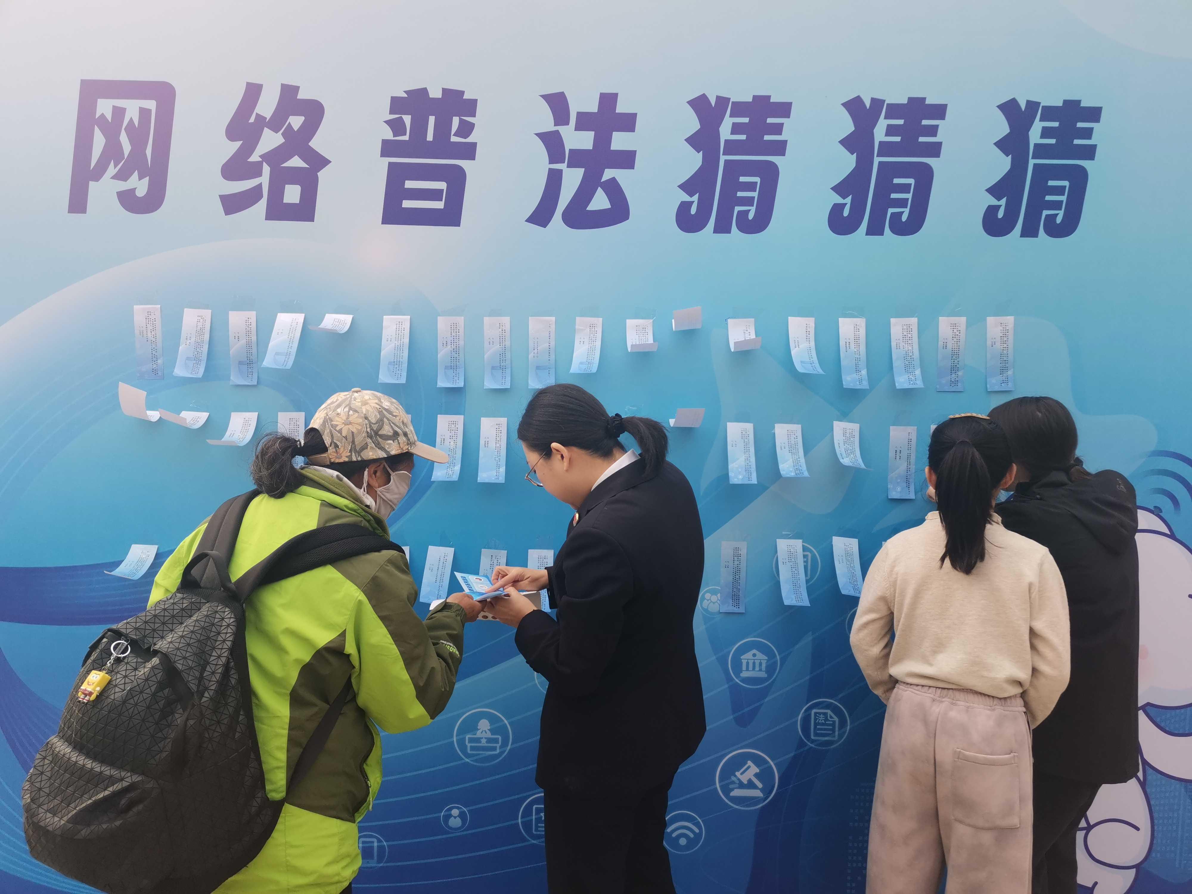猜謎語(yǔ)、繪圖畫、拼拼圖、玩游戲……11月9日下午,北京市通州區(qū)臺(tái)湖公園內(nèi)人聲鼎沸、熱鬧非凡,由北京市委網(wǎng)信辦主辦,通州區(qū)委網(wǎng)信辦承辦,通州區(qū)人民法院、通州區(qū)人民檢察院、通州區(qū)教委以及臺(tái)湖鎮(zhèn)人民政府協(xié)辦的“e法潤(rùn)京華·運(yùn)河平安獸 護(hù)網(wǎng)凈萬(wàn)家”網(wǎng)絡(luò)普法游園會(huì)正如火如荼地進(jìn)行。記者在現(xiàn)場(chǎng)看到,人們駐足觀看普法短劇并爭(zhēng)相和劇中的小主人公合影、在普法展板前聽檢察官以案講法、在網(wǎng)絡(luò)普法像框墻前打卡留念,在手繪布上畫下對(duì)網(wǎng)絡(luò)安全和文明上網(wǎng)的理解與期盼。而現(xiàn)場(chǎng)設(shè)置的網(wǎng)絡(luò)普法猜猜猜、普法拼圖大挑戰(zhàn)、網(wǎng)絡(luò)普法飛行棋等闖關(guān)游戲更是引起眾多小朋友的興趣和熱情,每個(gè)游戲區(qū)前都排起了長(zhǎng)隊(duì),在歡聲笑語(yǔ)中,針對(duì)未成年人的網(wǎng)絡(luò)保護(hù)知識(shí)也在孩子們心中扎根發(fā)芽。