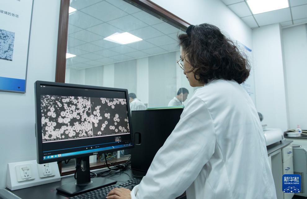 研究人員在浮法玻璃新技術(shù)國家重點實驗室內(nèi)利用顯微鏡觀察空心玻璃微珠(11月8日攝)。
