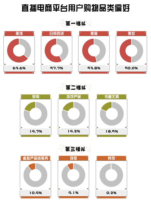 根據(jù)微播易、蟬媽媽等聯(lián)合發(fā)布的《2023年中國直播電商機(jī)會洞察報(bào)告》顯示,直播電商平臺用戶購物品類偏好中,美食位列第一梯隊(duì),占比達(dá)到53.8%,反映了公眾對食品消費(fèi)從吃得飽到吃得好的轉(zhuǎn)變。