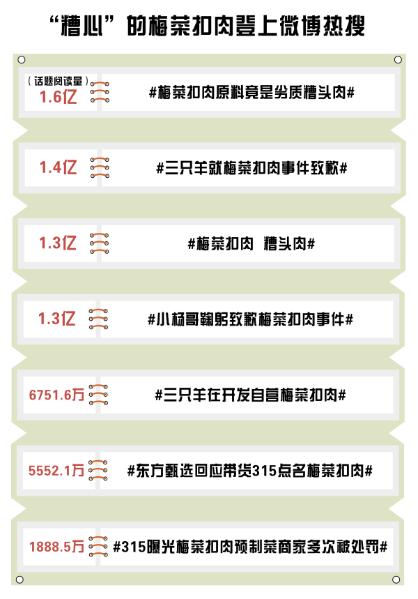 在引發(fā)行業(yè)震蕩后,該事件的影響從預(yù)制菜領(lǐng)域蔓延到直播帶貨領(lǐng)域,原因是東方甄選、主播“瘋狂小楊哥”以及其所屬的三只羊網(wǎng)絡(luò)科技有限公司均在直播間售賣過該產(chǎn)品。消息一出,輿論嘩然。對此,東方甄選、主播“瘋狂小楊哥”、三只羊網(wǎng)絡(luò)均作出回應(yīng)并致歉。從相關(guān)微博話題來看,“#梅菜扣肉原料竟是糟頭肉#”“#三只羊就梅菜扣肉事件致歉#”“#小楊哥鞠躬致歉梅菜扣肉事件#”等話題閱讀量均超過1.3億,輿論聲量頗高。