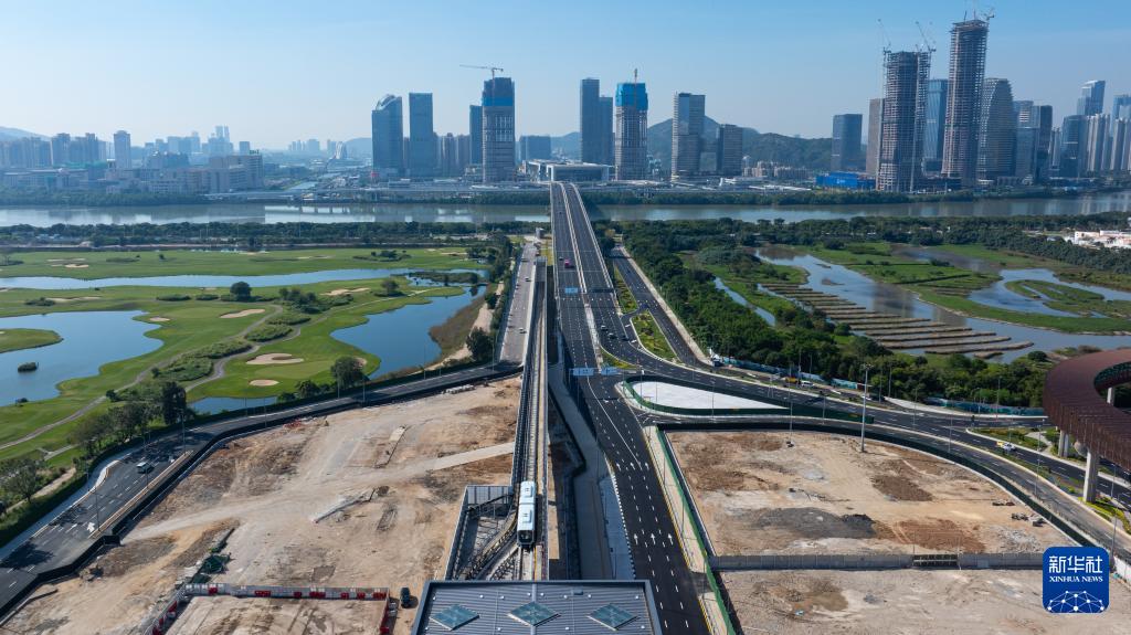 ??12月2日,澳門(mén)輕軌從蓮花站開(kāi)往橫琴站(無(wú)人機(jī)照片)。新華社發(fā)(張金加攝)