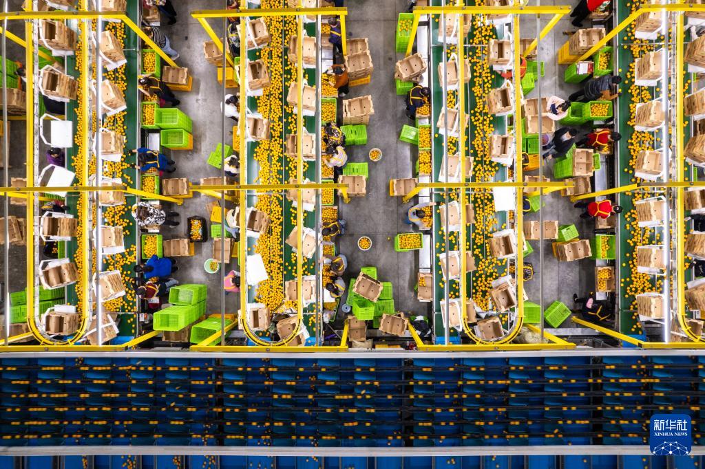 11月1日,在位于石門縣的湖南湘佳橘友農(nóng)業(yè)有限公司,工人在包裝柑橘(無人機照片)。新華社記者 陳思汗 攝