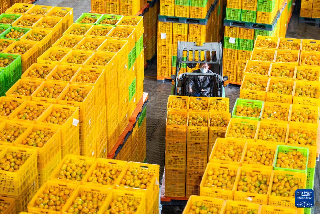 11月1日,在位于石門縣的湖南湘佳橘友農(nóng)業(yè)有限公司,工人在運輸柑橘。新華社記者 陳思汗 攝