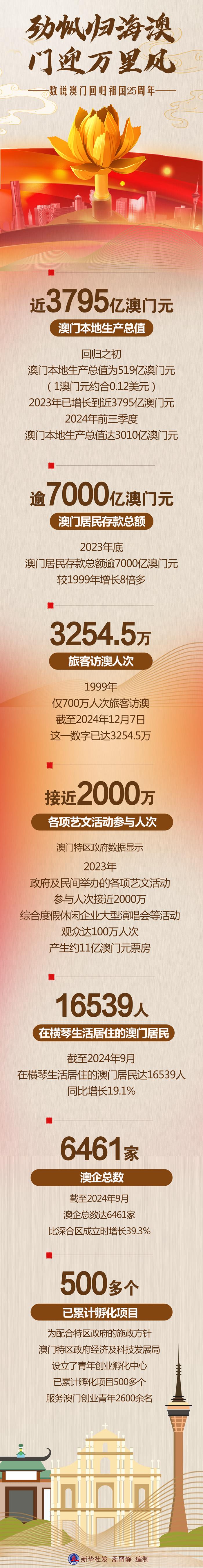 回歸祖國(guó)25年來,在“一國(guó)兩制”方針指引下,在中央政府和祖國(guó)內(nèi)地的大力支持下,澳門實(shí)現(xiàn)向現(xiàn)代化國(guó)際都市的華麗轉(zhuǎn)身。澳門特別行政區(qū)政府與社會(huì)各界攜手并進(jìn),積極探索適合自身的發(fā)展路徑,在經(jīng)濟(jì)、民生等領(lǐng)域取得顯著成就。 新華社發(fā) 孟麗靜 編制