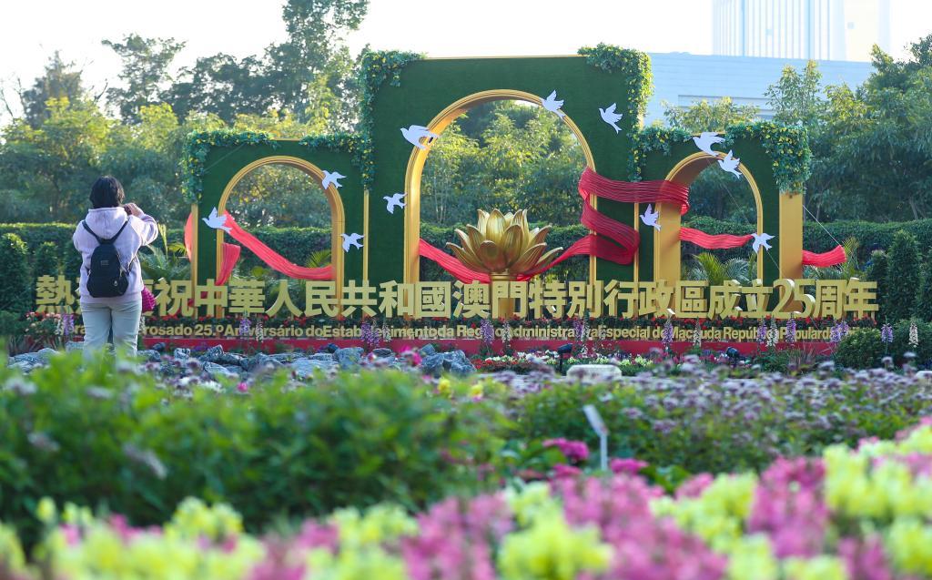 國旗區(qū)旗迎風(fēng)飄揚,條幅海報遍布街頭巷尾,豐富多彩的慶?;顒虞喎菆觥B日來,澳門處處洋溢歡樂喜慶的氣氛,全城熱烈慶?;貧w祖國25周年。